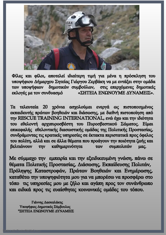 Μαζί μας στην κοινή προσπάθεια και στο ψηφοδέλτιο του συνδυασμού μας «Σητεία Ενώνουμε Δυνάμεις » και ο κύριος Γιάννης Δασκαλάκης.