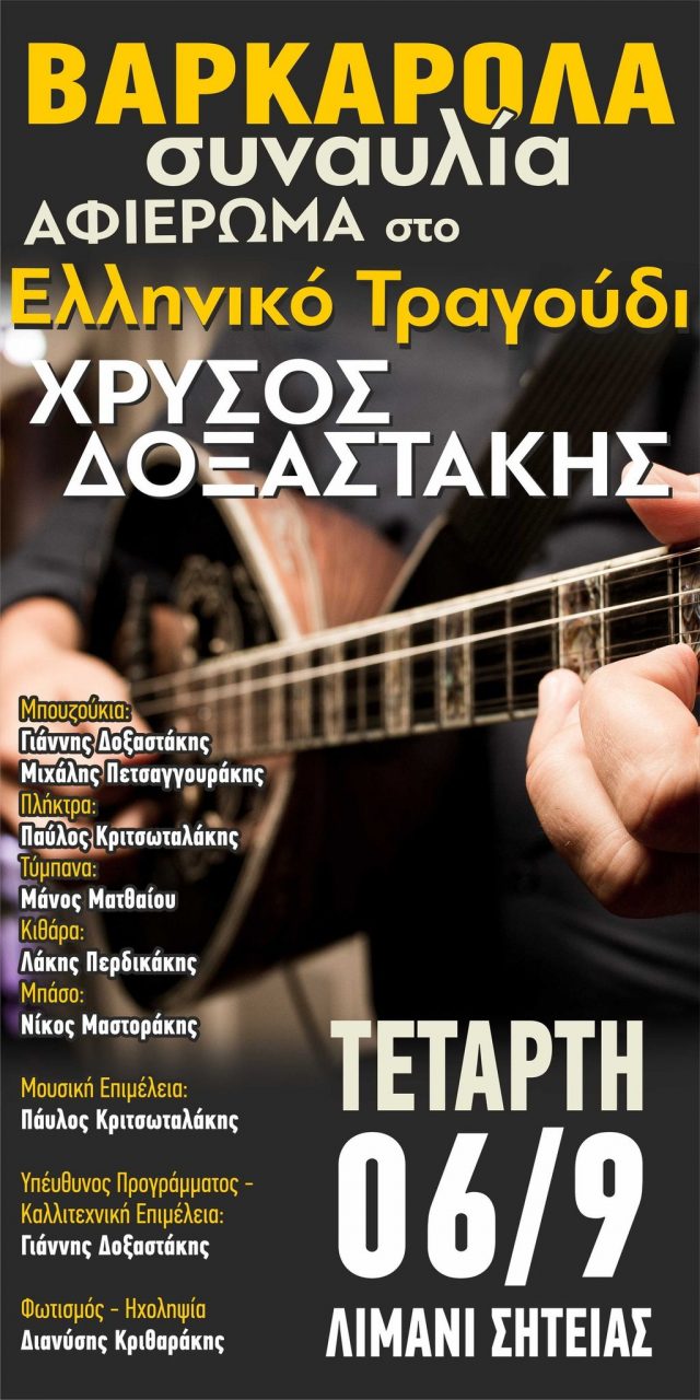 Τετάρτη 6 Σεπτεμβρίου και αποχαιρετούμε το καλοκαίρι με την τελευταία Βαρκαρόλα της σεζόν με ένα αφιέρωμα στο ελληνικό τραγούδι