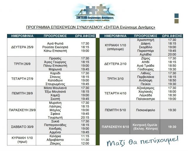 ΠρόσωπαΠρόγραμμα περιοδείας συνδυασμού “ΣΗΤΕΙΑ Ενώνουμε Δυνάμεις”Post Views: 2,030 Stavroula21. September 2023 Post Views: 2,030 Hightlight previous Η ανάγκη για ενεργό συμμετοχή των νέων στην Τοπική Αυτοδιοίκηση next Στην απονομή των βραβείων OTA AWARDS 2023 ο Δήμαρχος Σητείας
