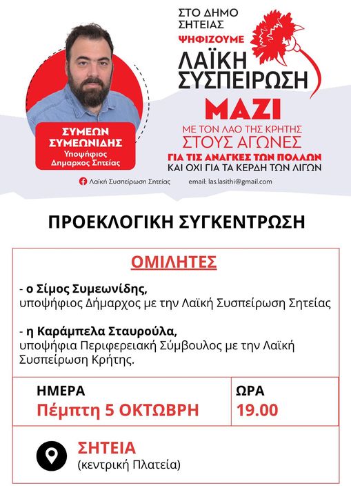 Θα μιλήσει ο Σίμος Συμεωνίδης, υποψήφιος Δήμαρχος Σητείας και η Καράμπελα Σταυρούλα, υποψήφια Περιφερειακή Σύμβουλος με την Λαϊκή Συσπείρωση Κρήτης.