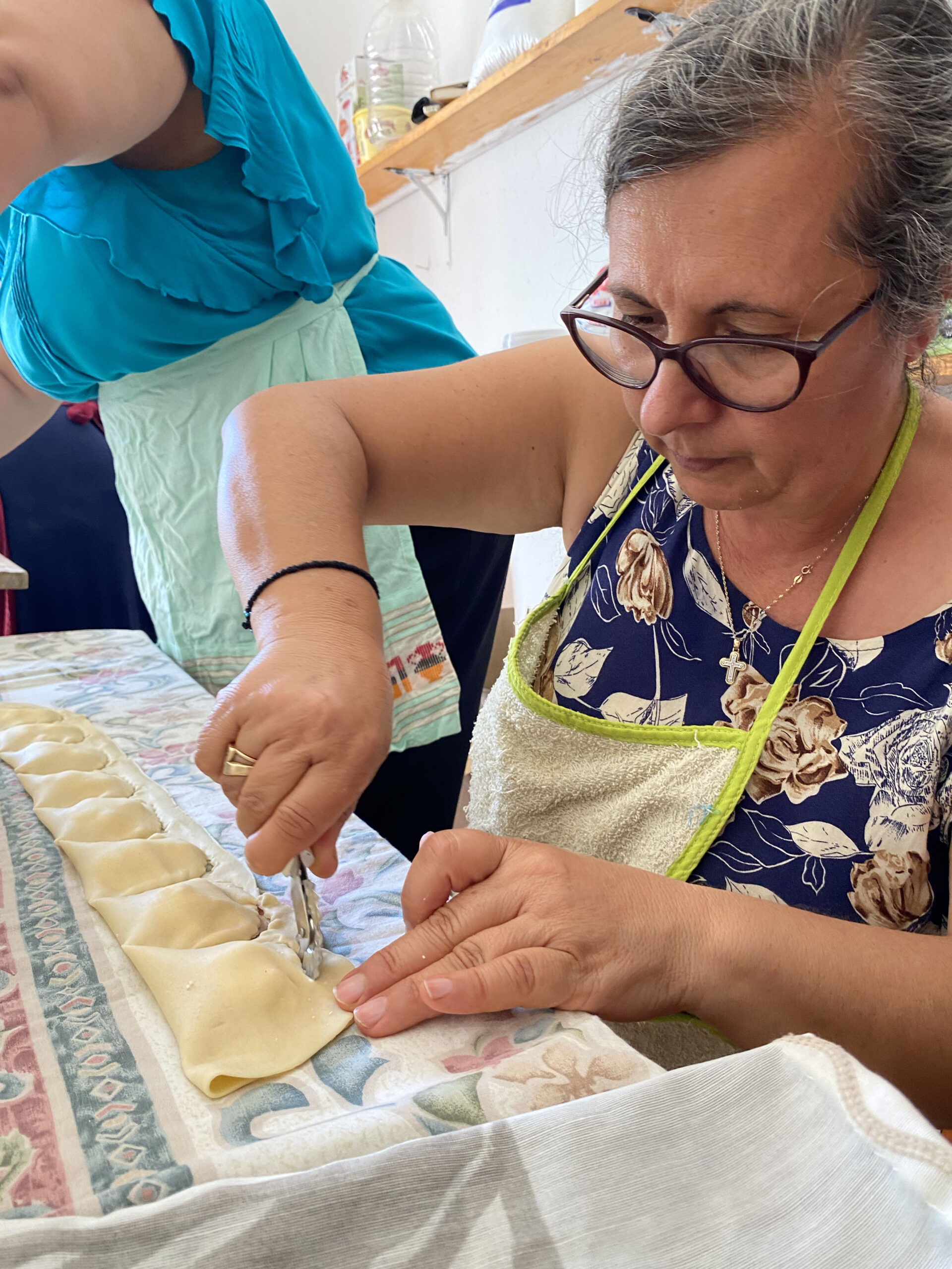 Φθάσαμε στη Δάφνη, ανήμερα του Αϊ-Γιαννιού του Ριγολόγου, μόλις είχε τελειώσει η εκκλησία. Κάτω από τον τεράστιο πλάτανο της πλατείας μας κέρασαν καφέ, ενώ οι ντόπιοι έκαναν προετοιμασίες για το βραδινό πανηγύρι. Το παλιό σχολείο, εκεί δίπλα ακριβώς από την πλατεία είναι το επίκεντρο των προετοιμασιών. Κάποιοι κόβουν τα τυριά, ενώ κάποιοι άλλοι στη διπλανή αίθουσα, ανοίγουν φύλλο και ετοιμάζουν τα τυροπιτάκια. Μία κυρία στην αυλή, έχει ξεκινήσει να καθαρίζει πατάτες. Θα έρθουν σίγουρα και άλλοι για βοήθεια καθώς βλέπω δίπλα της 5-6 τσουβάλια με πατάτες. Η χειροκίνητη, ασημί χρώματος μηχανή που ανοίγει το φύλλο έχει «πάρει φωτιά». Τα κεφτεδάκια είναι ήδη έτοιμα ενώ μέσα σε ένα μεγάλο ταψί έχουν έτοιμους τους γεμιστούς κολοκυθοανθούς.