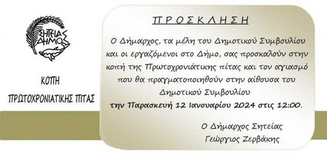 ΣητείαΚοπή της πρωτοχρονιάτικης πίτας στο Δήμο ΣητείαςPost Views: 885 Stavroula9. January 2024 Post Views: 885 Hightlight previous Συνάντηση του Δημάρχου Σητείας με τον νέο Αντιπεριφερειάρχη Αθλητισμού Λεωνίδα Τερζή next Η Υπηρεσία Πρασίνου αλλάζει την πόλη