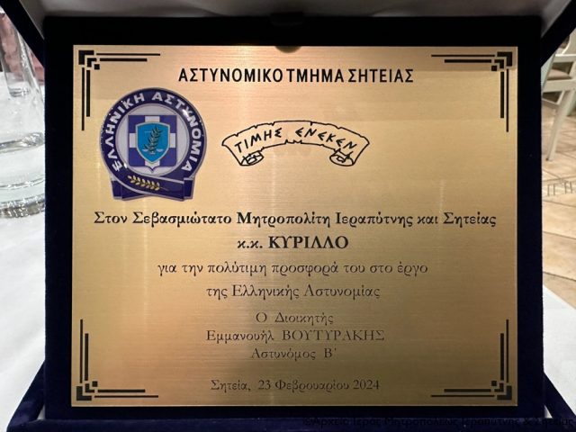 Κατά τη διάρκεια της εκδήλωσης ο Διοικητής κ. Εμμανουήλ Βουτυράκης, αφού ευχήθηκε χρόνια πολλά και κάθε καλό σε όλους τους παρισταμένους κατά το έτος 2024, ευχαρίστησε τον Σεβ. Μητροπολίτη κ. Κύριλλο για την τιμή να ευλογήσει τη Βασιλόπιτα του Α. Τ. Σητείας και του απένειμε τιμητική πλακέτα για την υλική και ηθική προσφορά και συμπαράσταση της Τοπικής Εκκλησίας στο έργο του Αστυνομικού Τμήματος Σητείας. Ο Σεβασμιώτατος ευχαρίστησε θερμά για την απονομή και ευχήθηκε από καρδιάς στον Διοικητή κ. Εμμανουήλ Βουτυράκη και στα στελέχη του Α.Τ. Σητείας καλή και ευλογημένη χρονιά με υγεία, δύναμη και επιτυχία στο δύσκολο έργο τους για την προστασία και ασφάλεια των πολιτών.