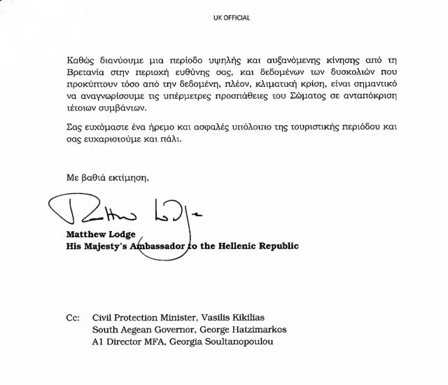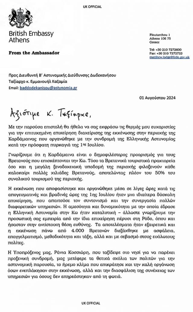ΠρόσωπαΕυχαριστήρια επιστολή του Βρετανού Πρέσβη στον Μανώλη ΚαζαμίαΕυχαριστήρια επιστολή του Βρετανού Πρέσβη προς τον Δ/ντη Β’ Αστυνομικής Δ/νσης Δωδ/σου Post Views: 981 Stavroula23. August 2024Ευχαριστήρια επιστολή του Βρετανού Πρέσβη προς τον Δ/ντη Β’ Αστυνομικής Δ/νσης Δωδ/σου Post Views: 981 Hightlight previous Δήμαρχος Σητείας: H πολιτεία και μόνο αρμόδια για την άριστη παροχή υγείας στον πολίτη next Τελετή αλλαγής διοίκησης στην 11η Μ.Σ.Ε.Π. Ζήρου Σητείας