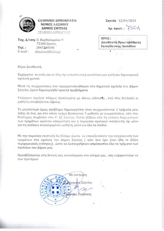 Να επανεξετάσει το θέμα των συγχωνεύσεων στα σχολεία του Δήμου Σητείας ζητά με επιστολή του, προς τον Διευθυντή Πρωτοβάθμιας Εκπαίδευσης Λασιθίου, κ. Γιώργο Μαμάκη, ο Δήμαρχος Σητείας κ Γιώργος Ζερβάκης.
