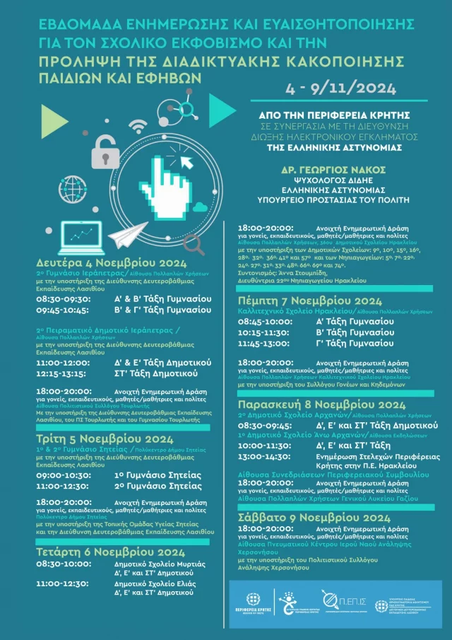 Όσον αφορά το Δήμο Σητείας, οι ενημερωτικές συναντήσεις πραγματοποιήθηκαν την Τρίτη 5/11 στο αμφιθέατρο του Πολύκεντρου του Δήμου Σητείας με πρωινά τμήματα μαθητών από τις σχολικές μονάδες του Δήμου και μία απογευματινή συνάντηση ενημέρωσης για εκπαιδευτικούς και γονείς. Οι ενημερωτικές δράσεις υλοποιούνται από τον Ψυχολόγο της Διεύθυνσης Δίωξης Ηλεκτρονικού Εγκλήματος Δρ. Γεώργιο Νάκο σε συνεργασία με τη Διεύθυνση Δευτεροβάθμιας Εκπαίδευσης Λασιθίου και τους/τις διευθυντές/τριες των σχολείων, τους Συλλόγους Διδασκόντων και τους Συλλόγους Γονέων και Κηδεμόνων.